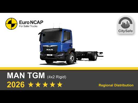 MAN supported the HGV safety rating scheme by providing a TGM equipped with all the relevant safety options for assessment. The TGM is MAN's first 5-star rated truck, just achieving the rating with well balanced performance across Safe Driving, Crash Avoidance and Post Crash Safety. Its direct vision is adequate, however an optionally available, very good camera monitor system provides enhanced driver vision. The direct driver monitoring system supports safe driving by detecting drowsiness in real time and the system can bring the vehicle to a safe stop if the driver is unresponsive. A range of high performing AEB and lane support collision avoidance technologies are available for the TGM, the only notable absence being an AEB system for protecting cyclists in nearside turning collisions. The TGM earns its CitySafe award by the high performing indirect vision and frontal collision avoidance technologies options compensating for the adequate direct vision and absence of nearside turn AEB cyclist protection.