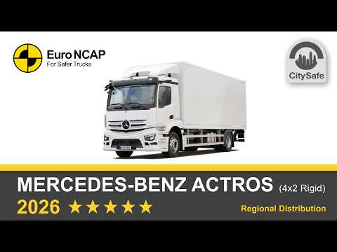 The Mercedes-Benz Actros has been tested following improvements to active safety software compared to previously rated models, and is available with many of the safety features that Euro NCAP consider beneficial to the safety of trucks. Mercedes-Benz, in contrast to many competitors, provides some of its more advanced technology as standard - most impressively protecting a cyclist in a nearside turn across path situation. The Actros direct vision is good owing to the mid cab mounting height in regional distribution specification and the camera monitor system enhances the driver's rearward view. A range of high performing safe driving and crash avoidance safety technologies are available which can support the driver in reducing the risk of a collision. The direct and indirect vision, pedestrian and cyclist frontal AEB protection and nearside turn cyclist AEB system all enhance the safety performance in cities and earning the CitySafe award. The Actros also offers good support for the driver on motorways with good AEB and lane support suggesting that the Mercedes-Benz Actros is a safe choice for regional distribution operations providing the correct level of equipment is optioned.
