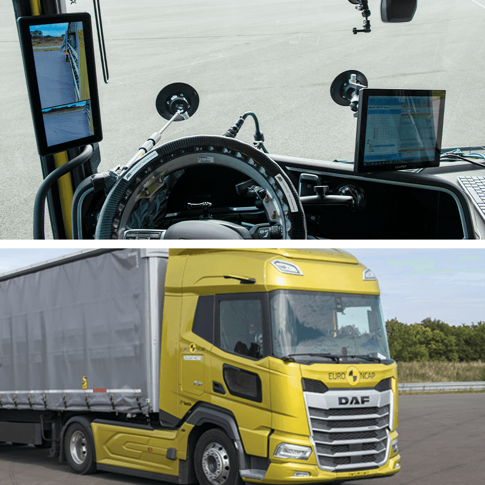 To encourage greater safety of trucks, Euro NCAP conducts a range of tests and assessments, which include: approaching a slower moving & stationary car – turn across the path of a cyclist – pedestrian crossing the road – lane keep assist – emergency lane keeping in overtaking traffic.
