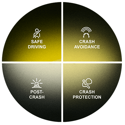 Crash Avoidance represents the seconds prior to a collision where Advanced Driver Assistance Systems (ADAS) can help mitigate or avoid a collision. Systems such as Autonomous Emergency Braking (AEB) can identify a vehicle in front or a crossing pedestrian and automatically brake. Lane Keep Assist (LKA) can prevent a distracted driver from crossing a lane into the path of an oncoming car.